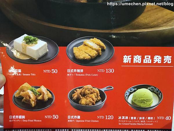 3/13起推出的5款單點配菜新品,為台灣獨賣喲!5款新菜色為:日式炸豬排、日式炸雞、胡麻豆腐、日式炸餛飩及冰淇淋,其中冰淇淋有香草、抹茶、椰奶三種口味。看菜單不是什麼特別的菜餚嘛!那得來吃看看才能評分高下囉!
