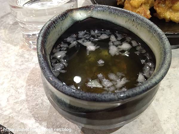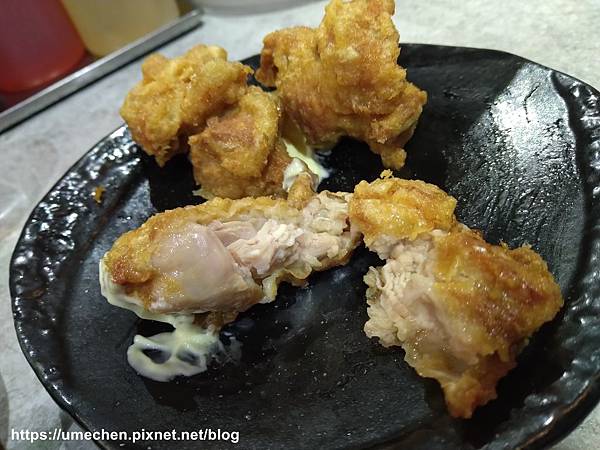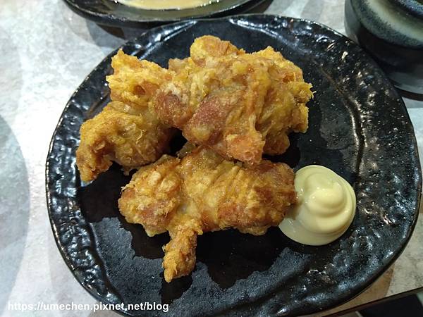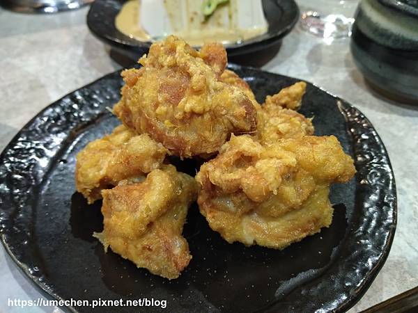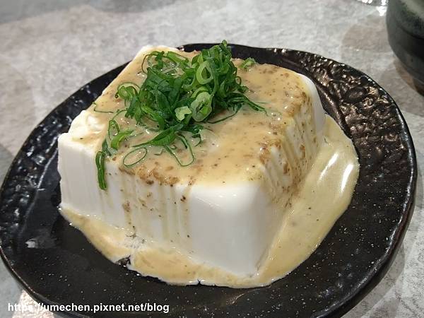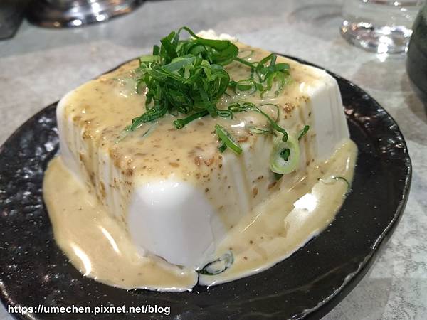 熟女點的是日式炸雞、胡麻豆腐。日式炸雞一盤約5、6塊的數量,附一球美乃滋醬,炸雞外皮相當酥脆,外皮醃製十分入味,也不會過鹹(熟女每次都怕雞排、炸雞弄太鹹),裡層肉質仍然帶汁、鮮嫰,夠水準的好吃炸雞,熟女我整盤都吃光。