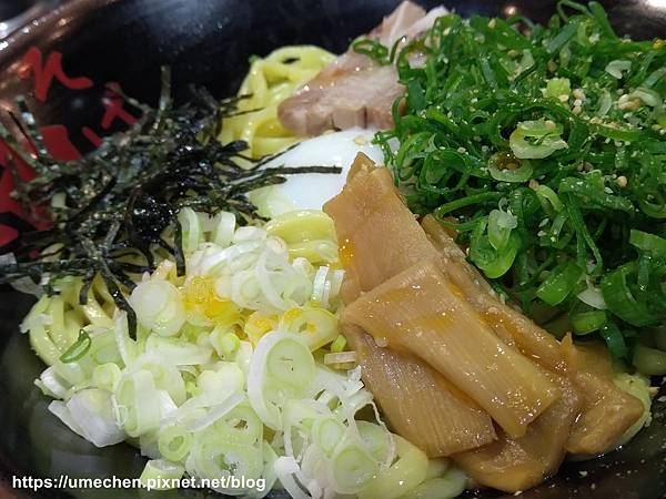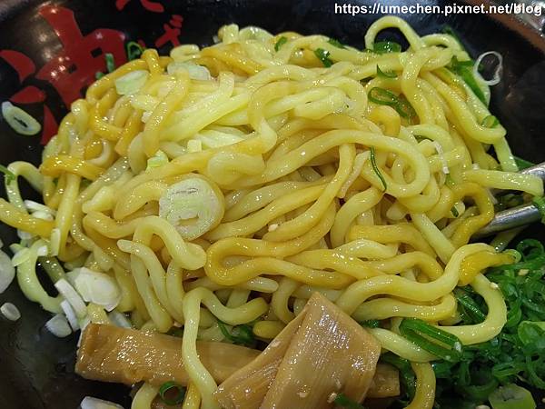 這是一碗具時間性的油拌麵。果然店家說趁熱迅速攪拌及享用,真的有其依據。油拌麵因為沒有拉麵的湯頭保持熱度與調味,完全以麵條和那一點點的調味料決勝負,因此必須趁熱度還在時,將味道均勻分佈的動作完成,以利入味。所以熟女這次照片都拍很快,咻咻幾張拍完趕快食用。