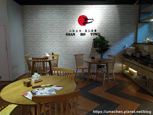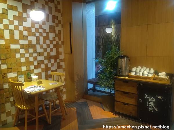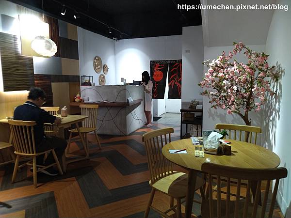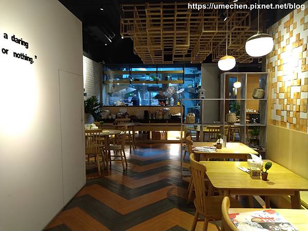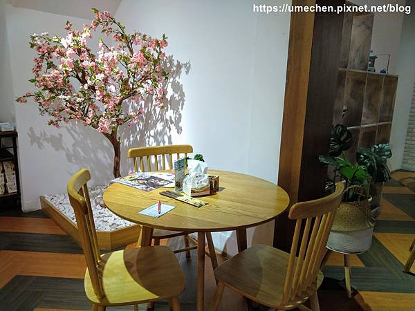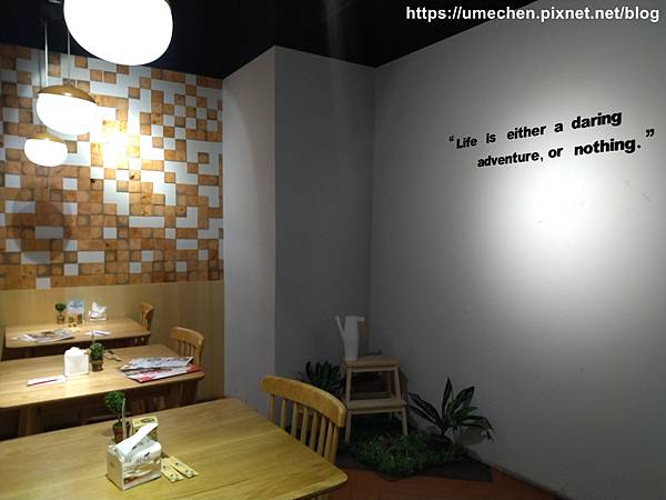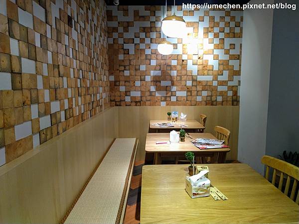 小圓桌裡頭的狹長區域,靠牆為一長型榻榻米座椅,小方桌適合2人對座,或2大1小的組合;此狹長區域一面白牆以黑字的英文勵句為裝飾;另一面以有著年輪的方型小木片做為構圖元件,讓L的牆面顯得與眾不同,也是很不錯的拍照牆。