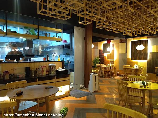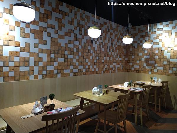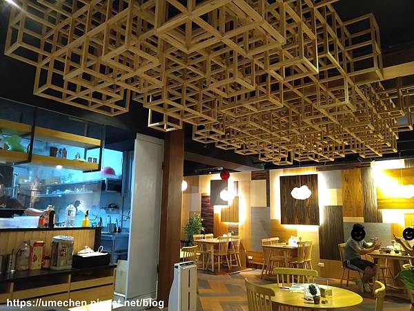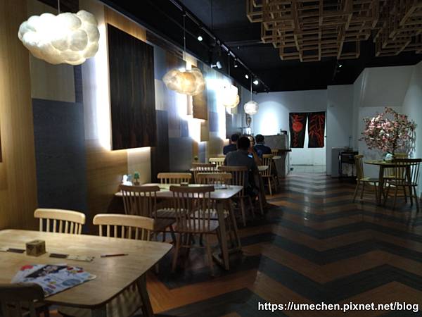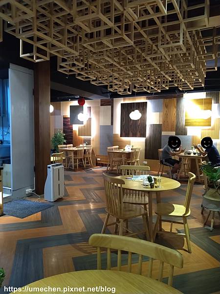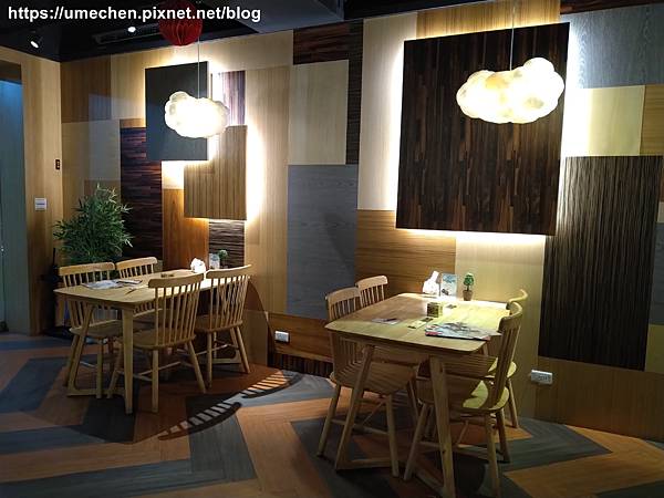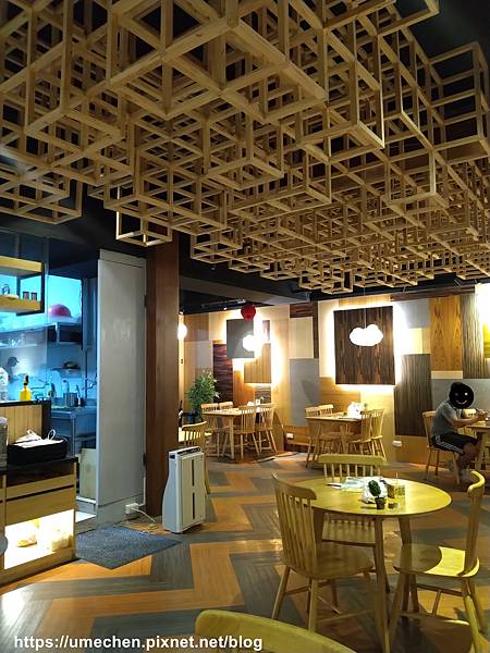 內部空間寬敝,座位安排寬鬆、不擁簇,與鄰座保持舒適的距離。座位主要分三區塊不同風格,首先進門看到的長形區域,多為4人對座的座位,燈飾為飄浮的雲朵造型;牆面以不同木料建材圖樣,方型或長方型不規則幾何拼貼,深淺、異材質之間產生的視覺變化,頗具設計感。