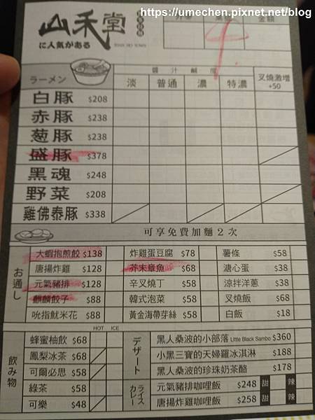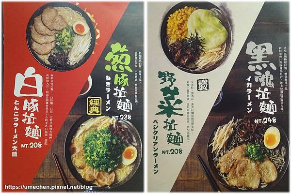 山禾堂的拉麵屬日本博多系,在MENU上看到以顏色來區分拉麵,一時可能搞不太清楚,〝白豚〞為原味;赤豚代表紅紅的辣味;黑魂則是墨魚汁與黑麻油;野菜當然是素食者的蔬食風味。
