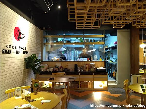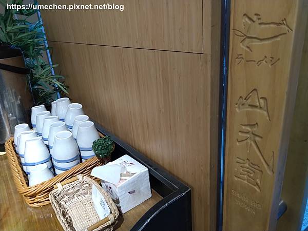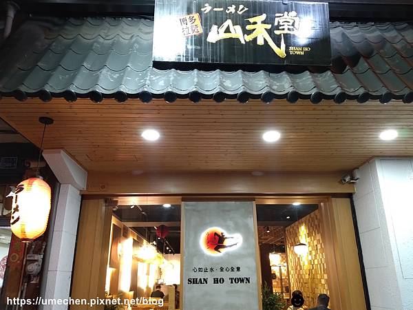 「山禾堂拉麵」草屯店門面為濃濃的日式禪風。仿青瓦的斜式屋簷,爽潔的白底牆面搭配斜斜交錯的原木條,外面看不太到客人用餐狀況,讓用餐者保有合宜的隱私。