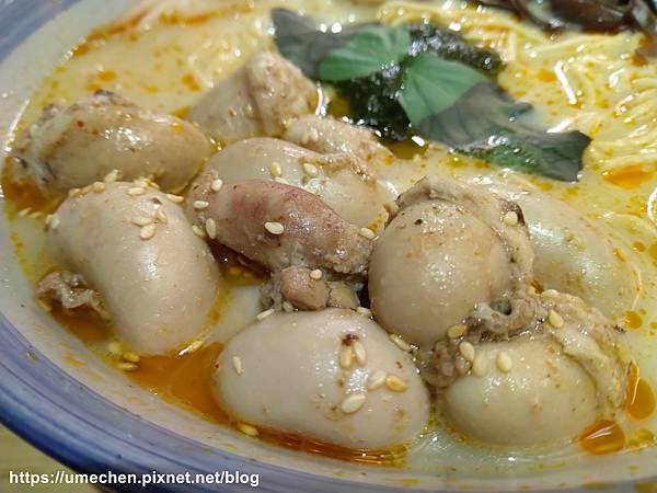 略帶酸辣味的泰式豚骨湯頭,乳白色濃郁湯汁泛著微微辣油,也加入羅勒橄欖油,不會過酸、過辣、過鹹,喝起來好過癮,熟女可以喝半碗湯沒問題。