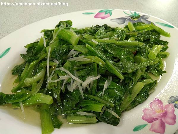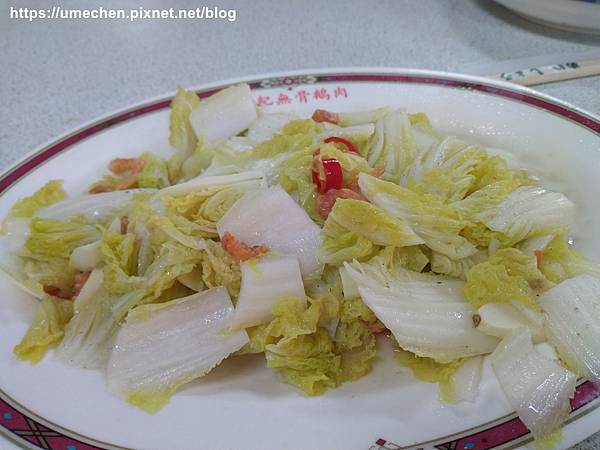 想吃的炒豆苗賣完了,換點這道炒娃娃菜。因為素食已經有二道綠色青菜,幸好換成娃娃菜,不會綠地一片,純蔬菜也有變化。娃娃菜最討厭太老變成大白菜,這道用蝦米以開陽白菜的方式料理,嫰度都還OK。