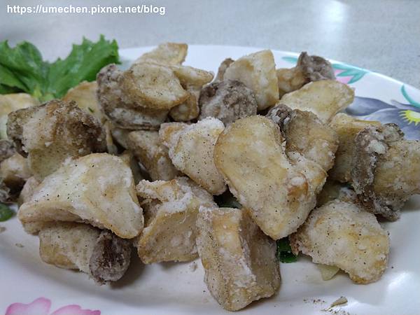 鹹酥杏鮑菇,正好素食也有一道麻油杏鮑菇,可以比較兩種的食感。鹹酥杏鮑菇料理得很好吃,外酥微鹹,菇體的汁液都有保留在裡頭,吃了要小心會噴汁和燙到舌頭。