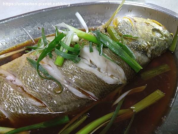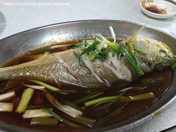 清蒸黃魚,也是秤重計價。黃魚不對剖、清蒸,上桌後將盤內的湯汁淋在魚肉身上,或是夾魚肉後沾湯汁。我們平常在家不會吃這種魚,來餐廳看到一定要好好品嚐一番,鮮嫰的一尾一下就吃完。