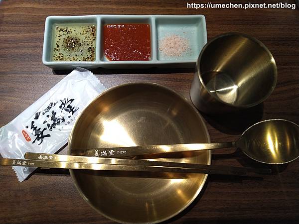 至坐位已備好在桌上的沾醬碟,包含海鹽、韓式辣醬及香油鹽,依肉品特色選擇適合的沾醬。姜滿堂只有少數肉品超過有事先醃製,餘為沒有調味的生肉,因此沾醬為主味道的來源,每種沾醬都給它試試,也是品嘗的樂趣之一。