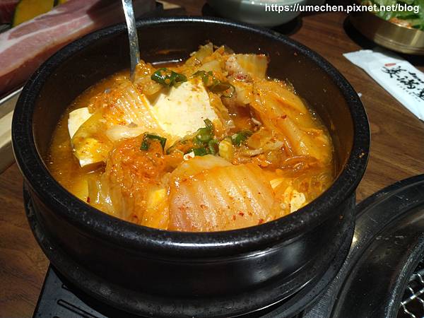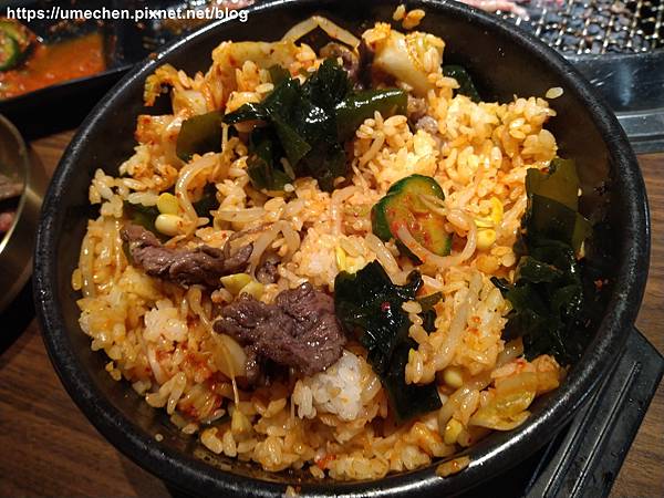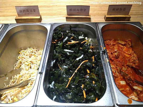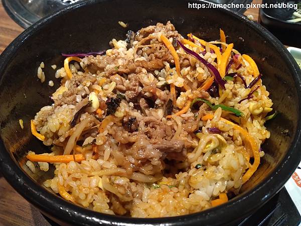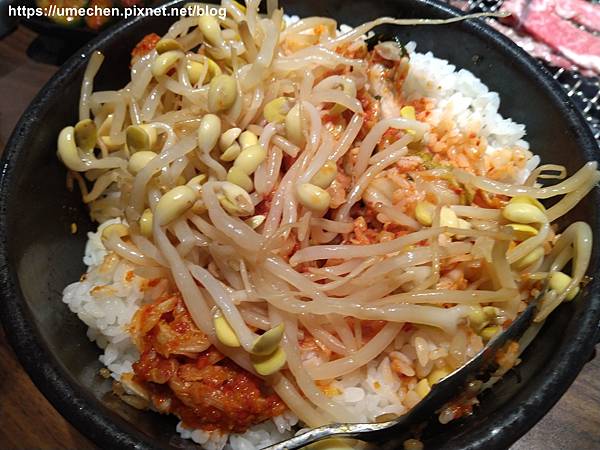 同行友人加點了白飯,原本送上來的石鍋拌飯四個人三二下完食,趁石鍋尚有餘溫時,將白飯倒入鍋內,再加上無限續加的韓式小菜,給它們拌一拌,有模有樣的石鍋拌飯又冒出一鍋啦!哈!除了沒有鍋巴,自助式石鍋拌飯也很不錯吃吔!