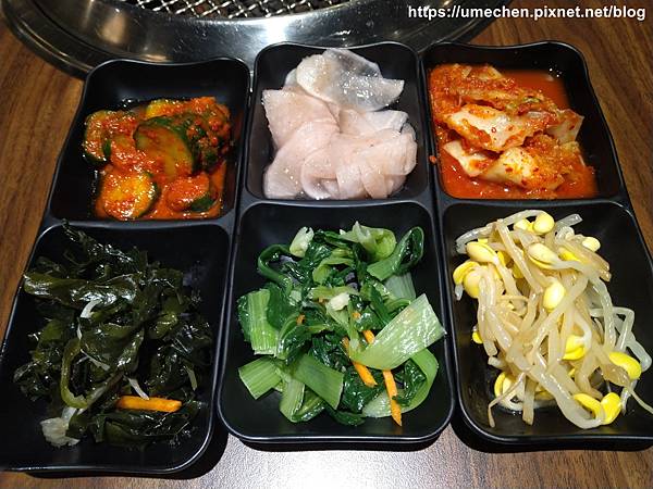 韓式料理必備各式韓式小菜,「姜滿堂」先直接提供6道小菜,若吃不夠自行至小菜自助區夾取。而小菜不會永遠固定那6種,總共有8道小菜輪番上陣,包含韓式泡菜、黃豆芽、茄子、洛神蘿蔔、涼拌時蔬、蒜味小黃瓜、醋溜海帶芽及辣味白豆干。