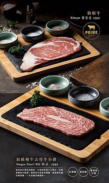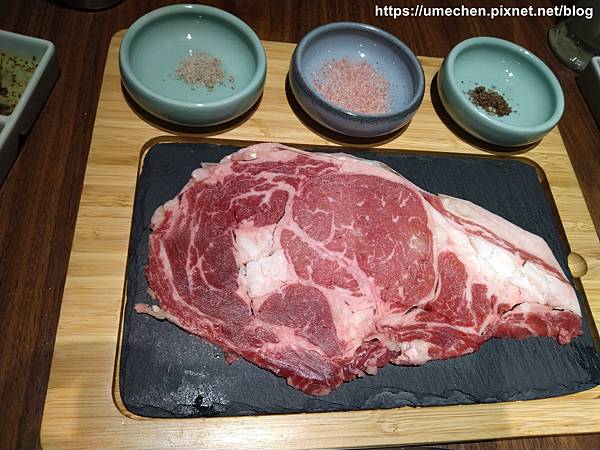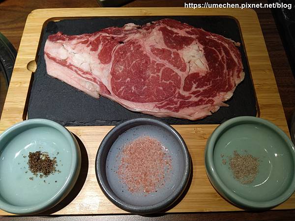 肋眼牛為單盤盛裝,並配有松露鹽、夏威夷紅鹽及黑煎鹽。新鮮好吃的肉品純粹沾一點鹽,最能提出肉質先天的鮮甜味,若鹽巴也有點變化或者是優質鹽,更是好上加好。這份肋眼牛是四人套餐的九種肉品裡,好吃排在前段班的。
