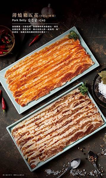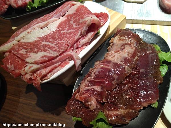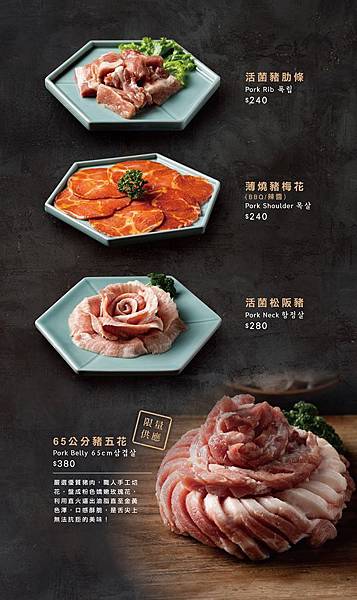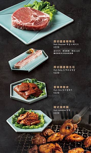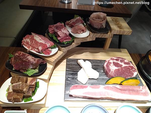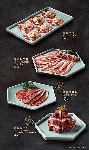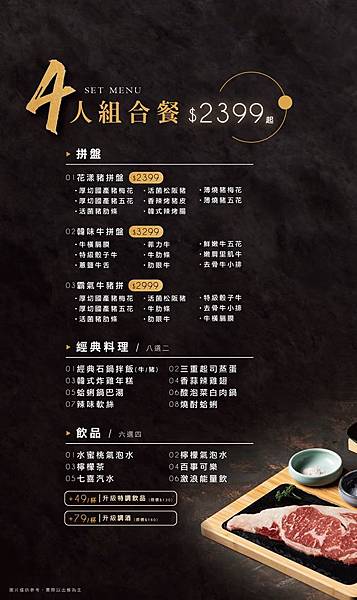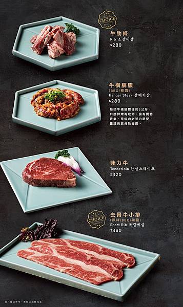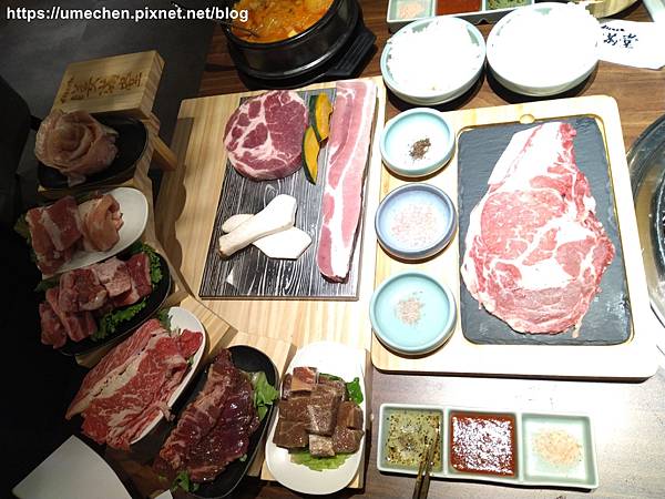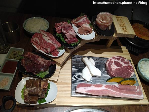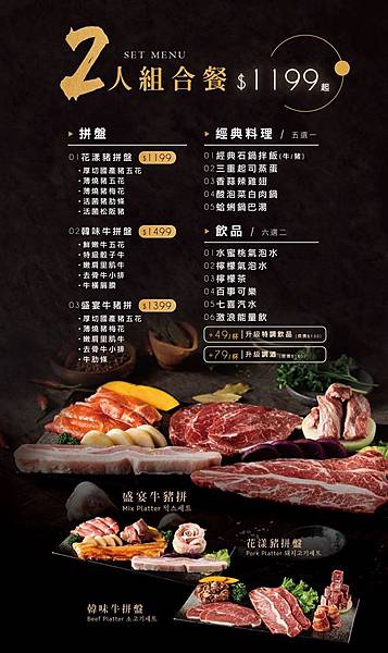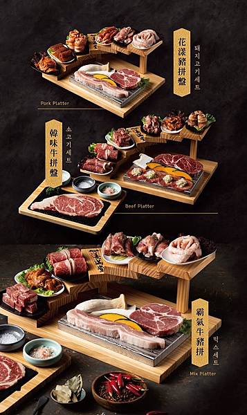 套餐的肉品拼盤,還有分 花漾豬、韓味牛、盛宴/霸氣牛豬拼盤,簡單說就是全豬、全牛、半豬半牛的選擇啦!當然三種的價位略有不同。像我們四人組沒有食用牛豬的忌諱,直接選霸氣牛豬拼盤。