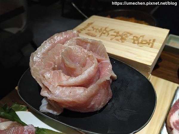 以步步高昇的階梯狀擺盤,非常有立體感,整體看起來好壯觀,具創意性的擺盤能增進用餐前的趣味與話題。其中活菌松阪豬以肉片為花瓣拼成一朵玫瑰花,看起來賞心悅目。