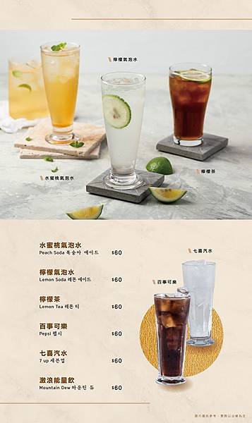 飲料為六選四,我們不約而同都選了氣泡水:水蜜桃、檸檬氣泡水,其他的可樂汽水怕肚子漲。