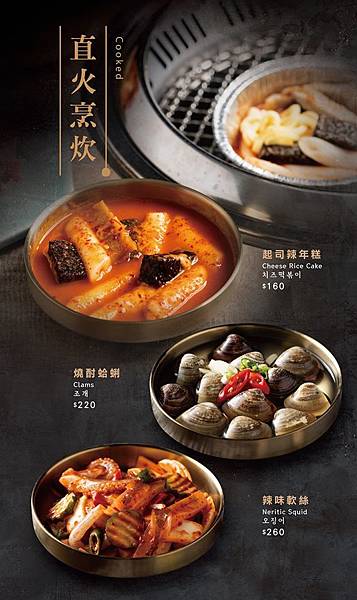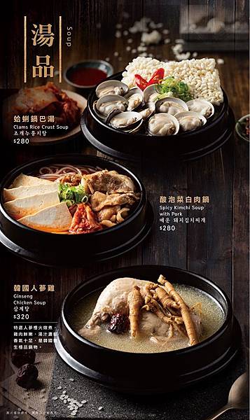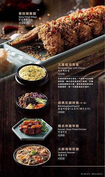四人套餐另供應韓式經典料理八選二,包括石鍋拌飯、起司蒸蛋、韓式炸雞年糕、香蒜辣雞翅、蛤蜊鍋巴湯……等,我們選了飯湯各一:石鍋拌飯、酸菜白肉鍋。