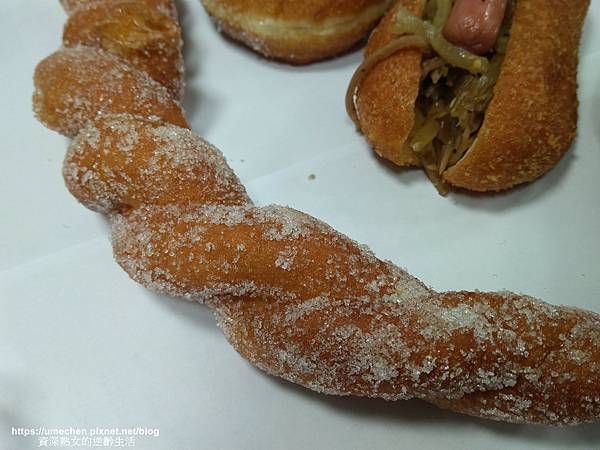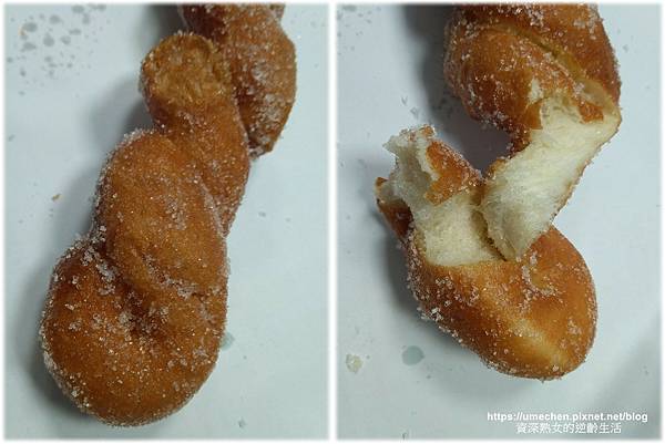 長長的麻花,因形狀、表面面積較甜甜為大,沾到的糖粉也較多,咬起來更具Q度。
