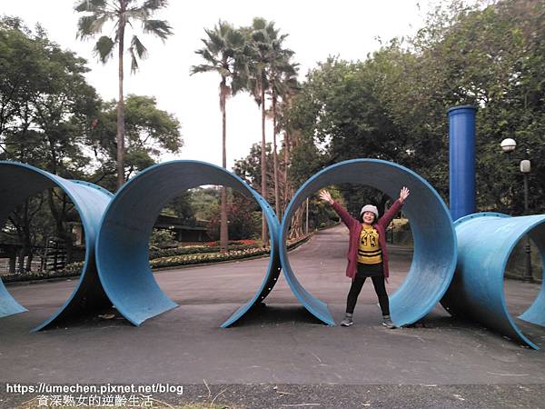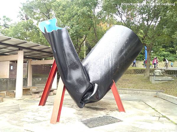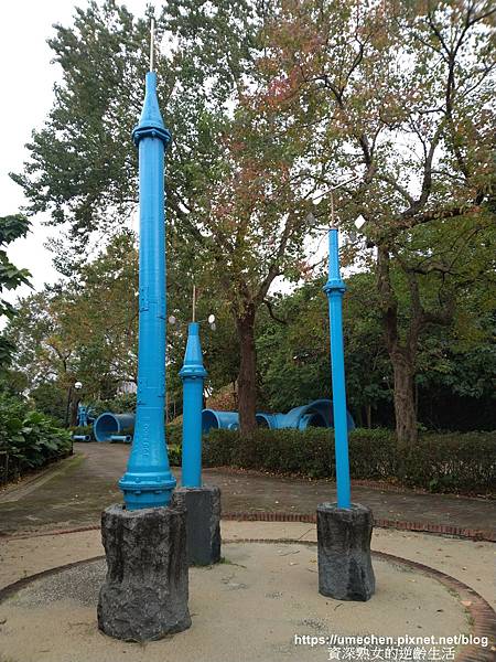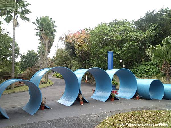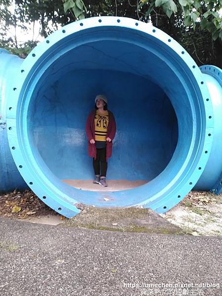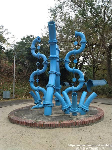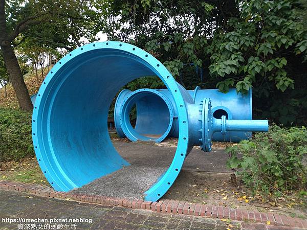 不少人只在自來水博物館後方區域的〝輸配水器材展示區〞走動,其實位在山坡上的〝消壓塔〞附近,還有一區戶外水管裝置〝管材雕塑區〞,幾乎很少人,這裡更好拍照、玩耍喲!