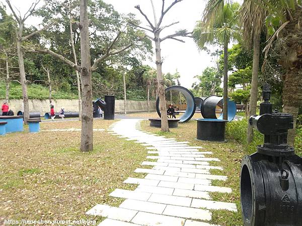 同樣以管路器材組裝成雕塑品、遊樂器材,還有溜滑梯、沙池、盪鞦韆,是小孩放電的好去處。