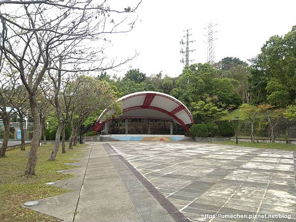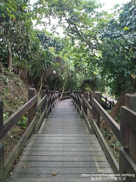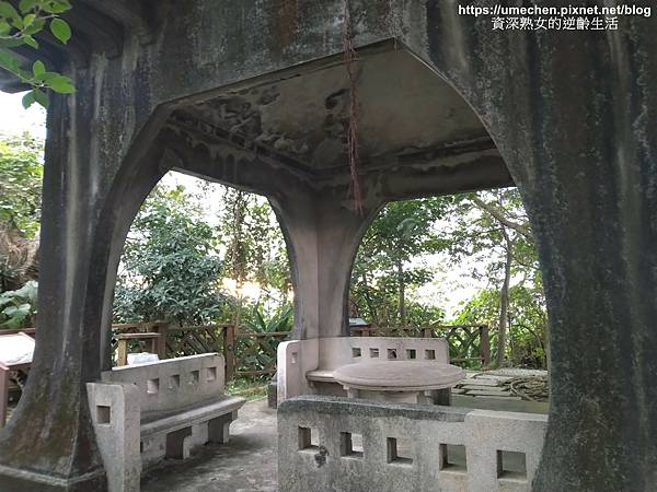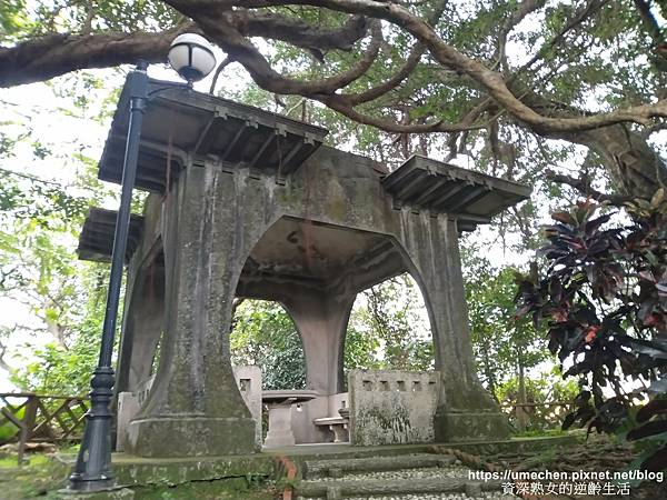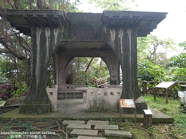 熟女由消壓塔方向的步道先行,接著走到一座造型獨特的涼亭〝觀音亭〞,生平首次看到如此造型的涼亭。周圍高大樹木之樹形優美,拍起照來也很有意境。