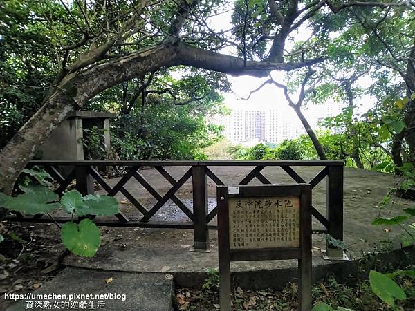 續走步道,來到〝反沖洗砂水池〞。乍看外型,是一座圓形水泥平台,看不出原始作用。說明牌清楚解釋本設備已於85年停役,是台灣最早的快濾操作淨水處理廠附屬設施,服務40餘載。