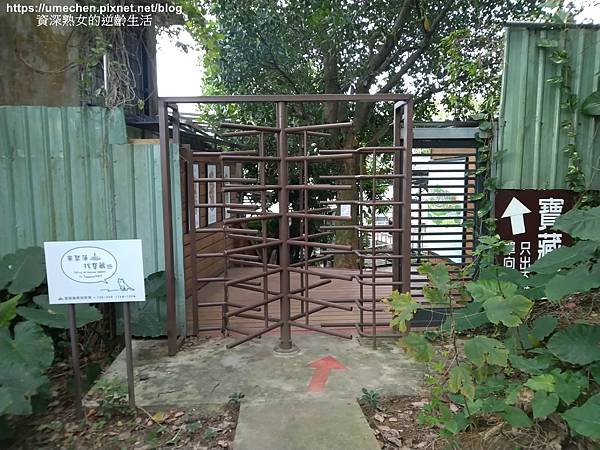 續行未久,看到一處園區出口,旁邊就是「寶藏巖」。此出口只出不進,無法從寶藏巖進入,惟對於想同時遊覽自來水園區、寶藏巖的朋友,為一方便捷逕。寶藏巖步行至捷運公館站,腳程也在10分鐘內。