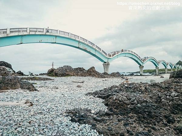▼ 站在礫石灘的礁岩上,眺望拱橋、許願島(離岸島)