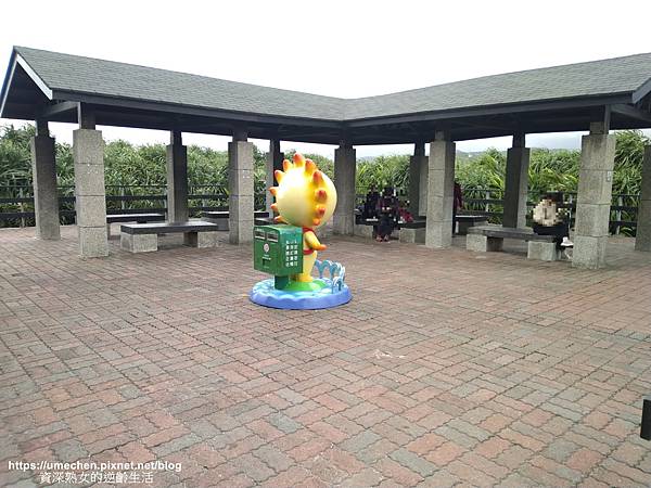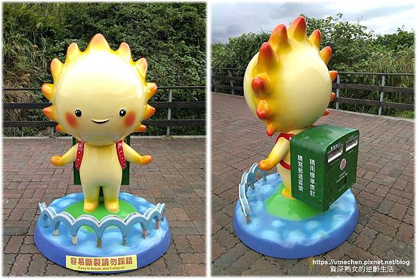 許願亭空地設有一座太陽寶寶許願郵筒,可愛的太陽寶寶腳前是八拱橋,站在藍色海水圍繞的綠色小島上;背後揹著綠色的郵筒。
