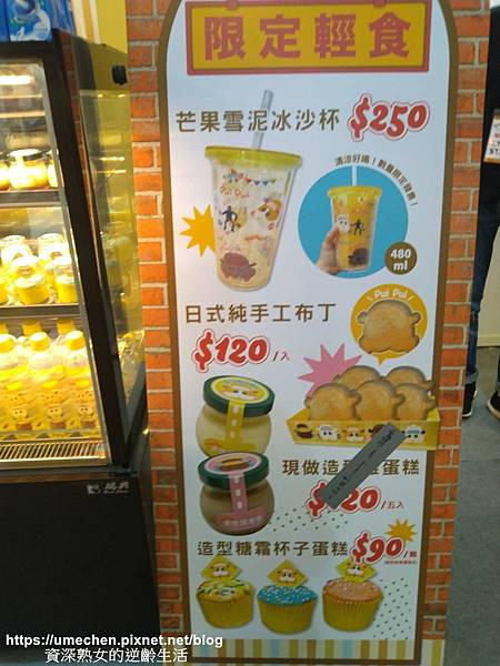 限定款的芒果冰沙、日式純手工布丁、造型糖霜杯子蛋糕、有天竺鼠車車圖案的瓶裝水,都可以外帶回家。