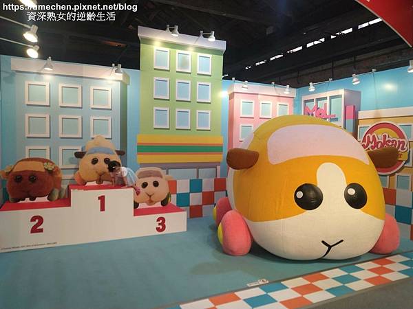 馬鈴薯氣偶周圍,佈置成動畫中的城市街景樓房,一旁還有前三名頒獎台,當然前三名都是天竺鼠車車包辦啦!一起和阿比、巧克力、西羅摩三位得獎者合影吧!