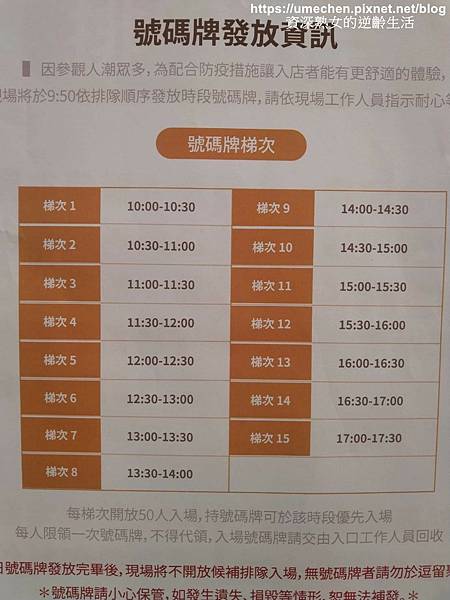 進入室內,請實聯制、酒精消毒雙手、量體溫。假日人潮眾多時,實施依每半小時之時段分流入場,以掌握室內人數。請參考下方時段列表。