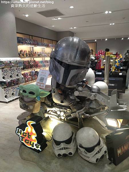 一是銀色鋼鐵人Mark 2等身雕像在門口坐陣;二是星際大戰STAR WARS曼達洛人和尤達寶寶雕塑組合,吸引很多玩家、公仔迷拍照、打卡。