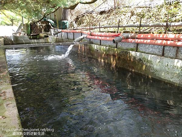 位在停車場內的魚池為長方型,紫藤花架下的紅磚建物即為山泉活水魚池,可帶小朋友去觀看魚群唷!