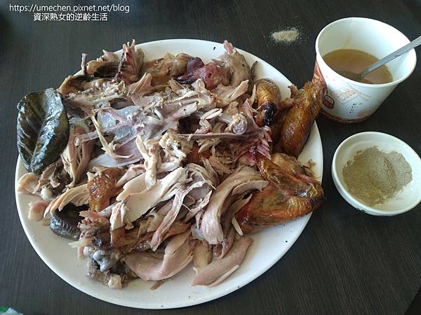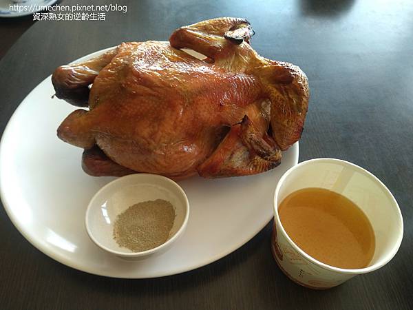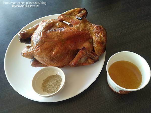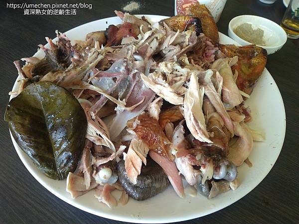 送來一整隻烤好的柚香桶子雞,附有雞油雞汁、胡椒。自己動手撕下雞肉,不論是沾取雞油或胡椒,都非常對味,連小孫子也吃得很高興。