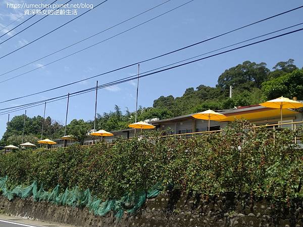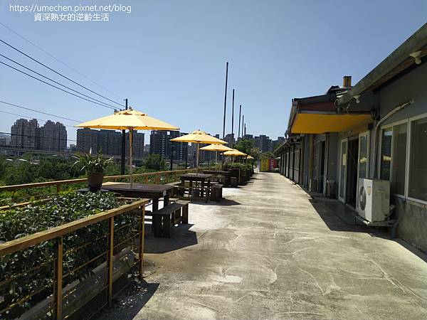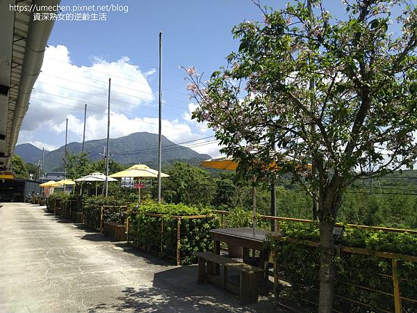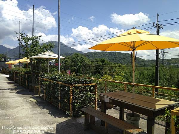 前院有一排戶外坐位區、遮陽陽黃色傘架,此處居高臨下觀看淡水地區的山景、市景。