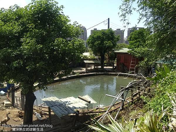 另一處魚池在停車場小屋旁邊,遊人不方便進入。後來熟女到山坡的桑葚園,從另一角度看到圓圓的魚池。