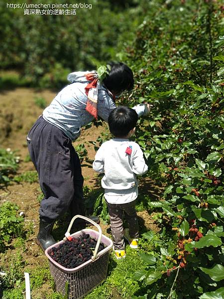 我們來到淡水富群休閒農園吃柚香桶子雞,吃完順道至山坡上的桑葚園走走,正好遇到店家在採桑葚,熟女和阿孫經由允許後,加入採桑葚的行列。