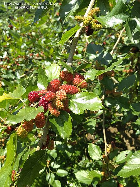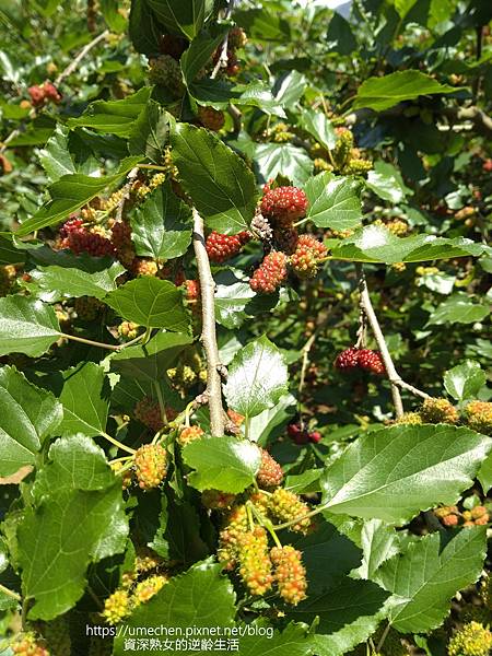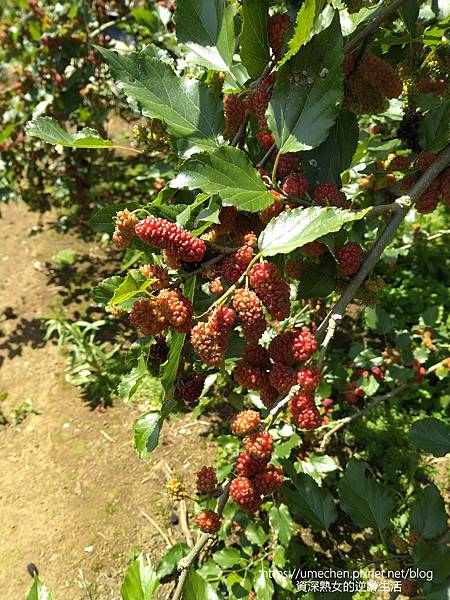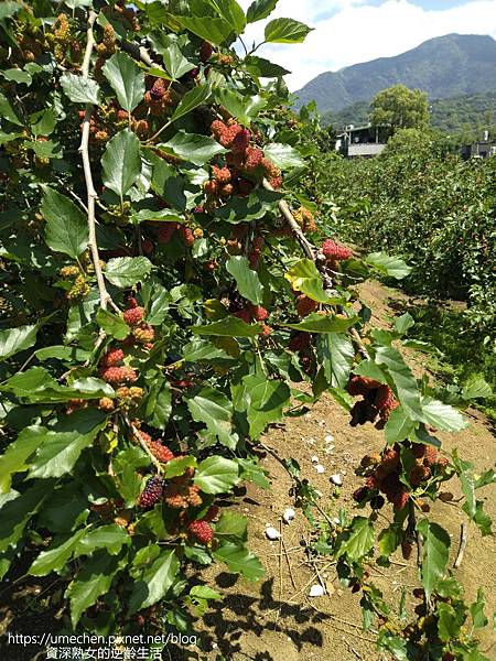 前院下方臨馬路邊,有一整排的桑甚園,我們正好看到結實纍纍的盛況。
