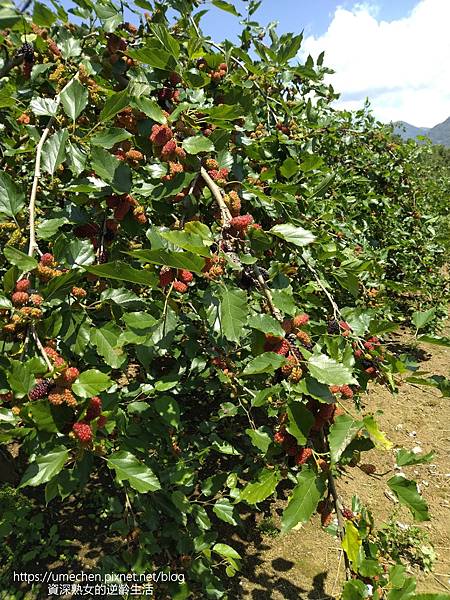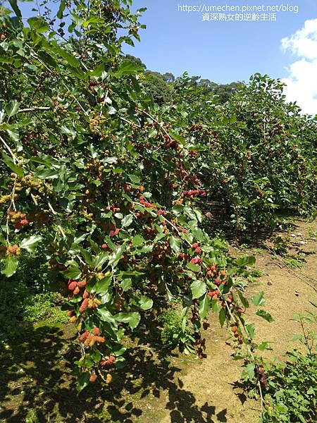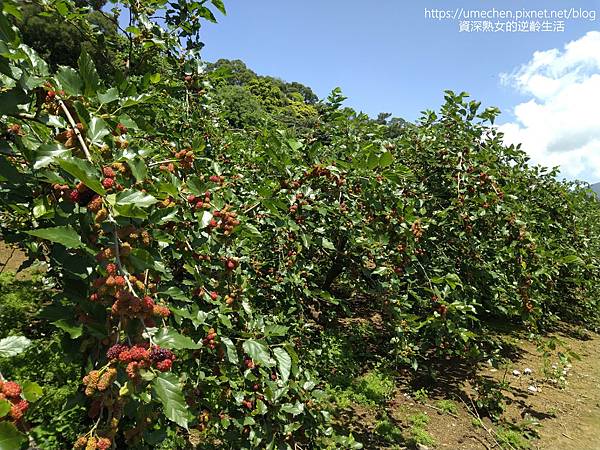 富群休閒農園的桑葚園,在馬路邊即有一整排,山坡上更多、更壯觀,陽光下的桑葚像串串紅色寶石,是相當營養的水果唷!