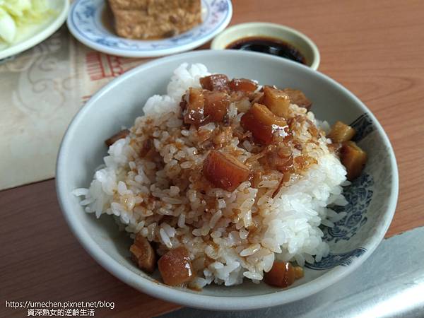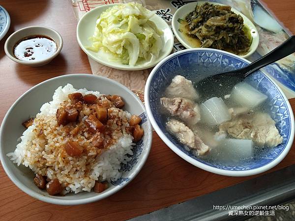 最對味的吃法,一定要搭配 滷肉飯,肥肉帶皮的滷肉,是熟女最愛,和原味排骨湯果真是絕配。滷肉飯上滷肉不算少,我個人喜歡每顆米都沾到滷肉汁,再點些小菜,就是豐盛又滿足的一餐。
