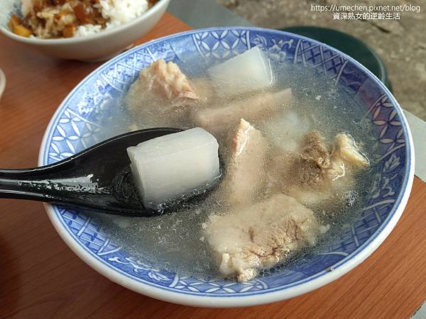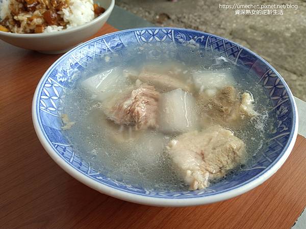 招牌原味排骨湯 必點,70元一碗喝很久。用整塊肋排、白蘿蔔、水去熬煮,沒有再加其他東西,所以稱原味。