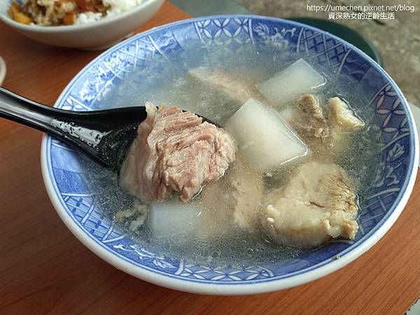肋排整塊、整條去熬煮,有人點餐才剪成小塊狀。肋排燉得夠爛,湯汁為簡單的清甜,卻十分耐喝,可免費續湯。