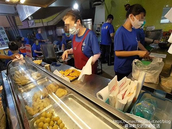 瑞字號旗魚黑輪,攤子約有8位穿藍色制服工作人員,顧這間只有外帶的攤子。
