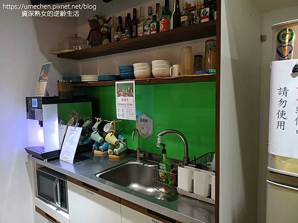 簡易廚房範圍不大,像個小吧台,煮個熱水、泡麵都OK,也有微波爐。有咖啡機,可以自己來杯現煮咖啡。