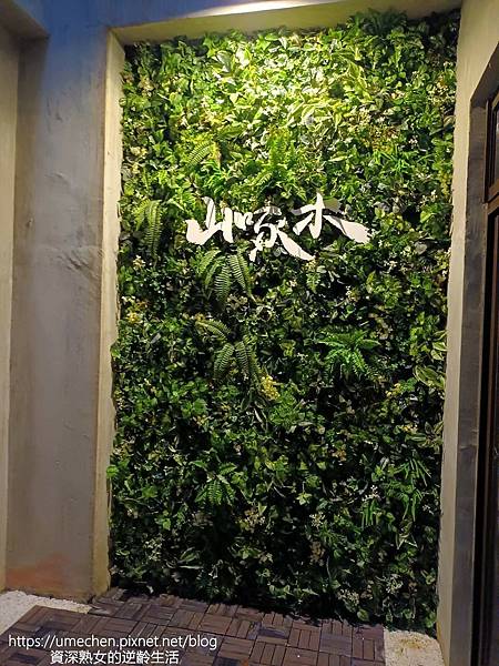 天井是一處迷人的小空間,佈置人造植生牆,並鑲上旅館的名稱:山啄木。