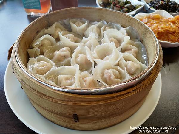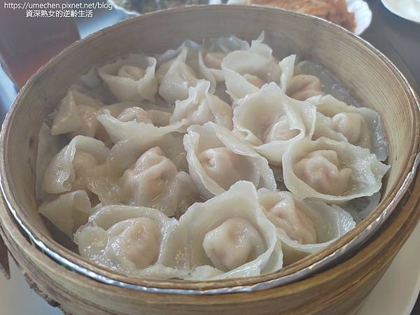 剛蒸好的魚餃,整籠端上,冒著熱氣。一個魚餃分2口咬下,有別於豬肉蒸餃,相當好吃,幾乎桌桌必點。