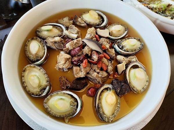 還有烤魷魚、炸魚料理、馬祖老酒燉九孔,加一盤餐後水果。