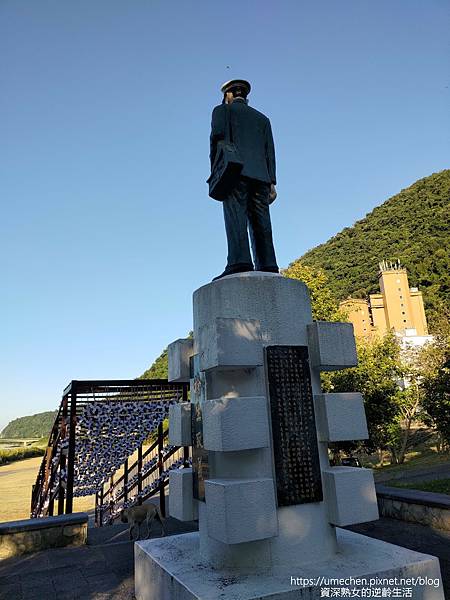 停車場旁的雕像、義行可風石碑,與白色斜張橋一樣,均為紀念郵務士溫勇南先生的義行。