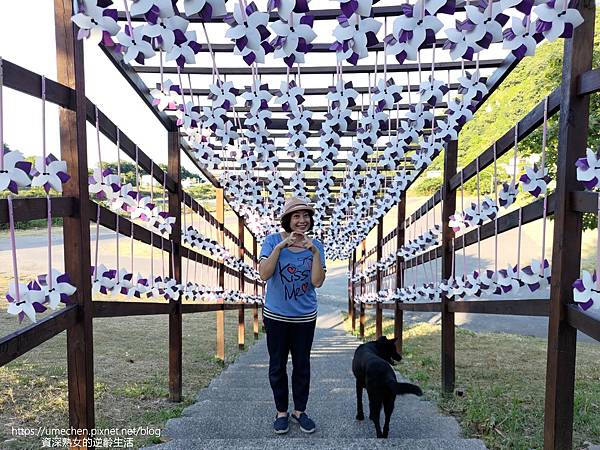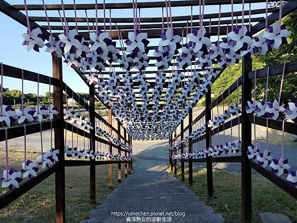 義行可風石碑前方的階梯,掛滿了紫白相間的小風車,像一座浪漫的風車隧道,是拍人像、合影的好地方。