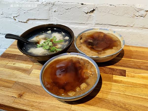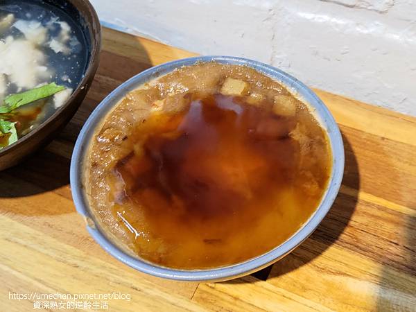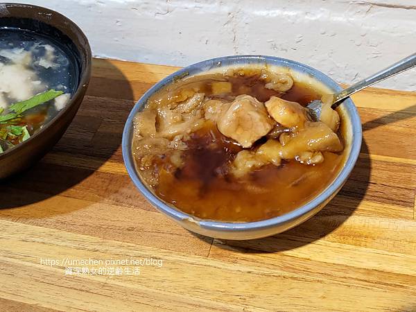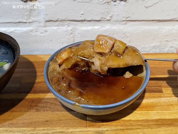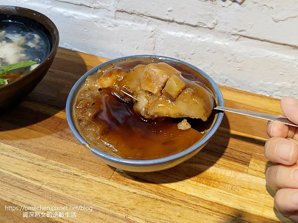 碗粿吃起來不軟爛,嫰中帶Q;配料有溫體豬後腿肉、火燒蝦、香菇,自製的醬汁+老滷肉燥,味道很鮮明。