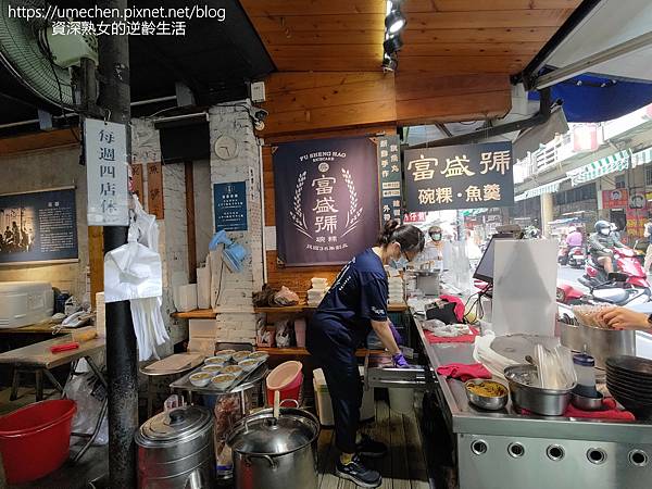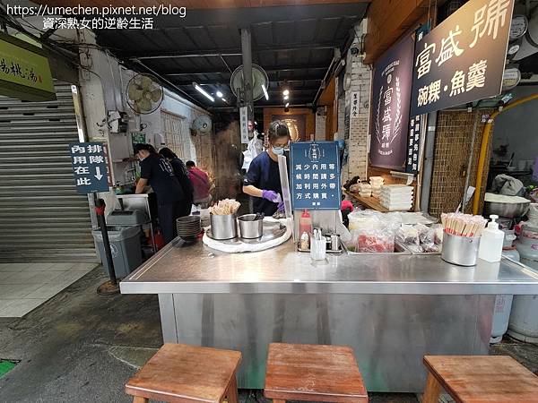 富盛號碗粿,老店在永樂市場國華街,店面非常狹小,本來還有幾個桌子,但有的放了東西,嚴格來說,店內只有一個長桌可供用餐,再來是巷弄口通道面壁的幾個坐位,然後就是攤位前的3個座位。